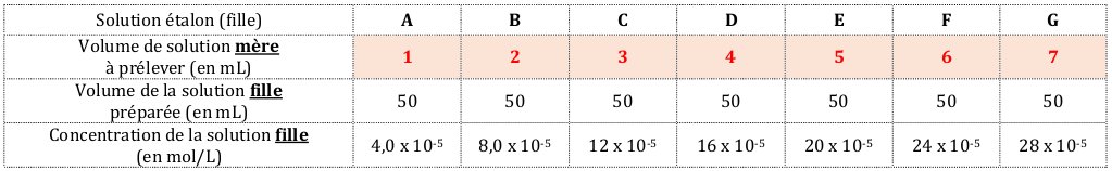 Pour réaliser le dosage par étalonnage, il faut d’abord préparer des solutions filles à partir de la solution mère à C 0 = 2,0 x 10 -3 mol/L.